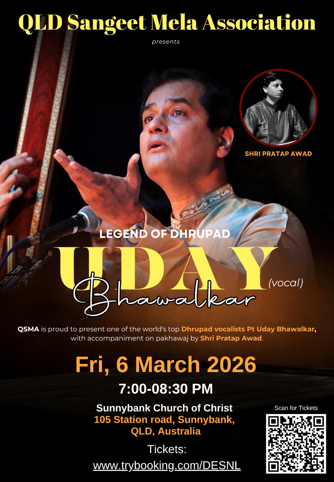 QSMA is proud to present one of the world’s top Dhrupad vocalists Pt Uday Bhawalkar, with accompaniment on pakhawaj by Shri Pratap Awad.